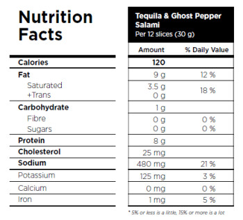 Pork, Salt, Tequila, Dehydrated pork stock, Spices and spice extracts, Dextrose, Ghost chili powder, Dried ancho chilies, Flavour (chili, paprika), Sodium ascorbate, Lactic acid starter culture, Sodium nitrite, Natural smoke.