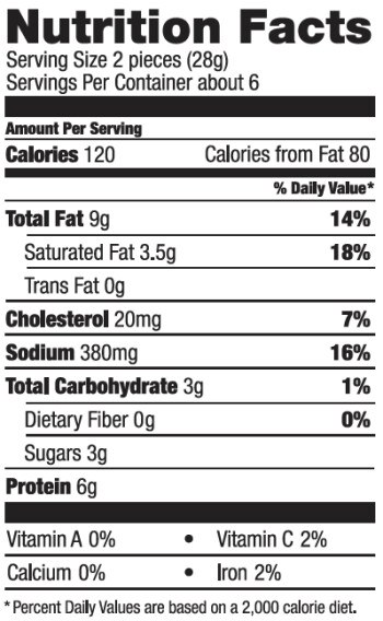 Pork, Dried molasses (golden syrup, molasses, caramel), Sugar, Salt, Dextrose, Tomato powder, Spices, Pea fibre, Vinegar powder (maltodextrin, white vinegar), Water, Smoke flavor, Natural flavor, Sodium ascorbate, Bacterial culture, Sodium nitrite, Smoke. In collagen casing.